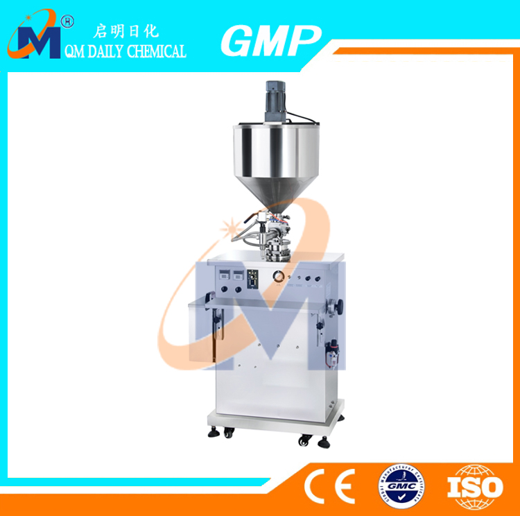 Heating and temperature control assembly of single head vertical temperature filling machine, and a stirrer, the water cycle heating layer applied to the material heating, ablation of the filling foundation cream, cream pearl, wax products, lipstick, jam etc.. The filling volume, the filling speed is convenient adjustable, more adjustable extra bottle shaped gauge differences, do not need to change parts, equipment adjustment; feed pipe is equipped with pneumatic ball valve, the filling materials at the same time can be blocked, prevent the material in the process of the emergence of material backflow, high filling material precision.