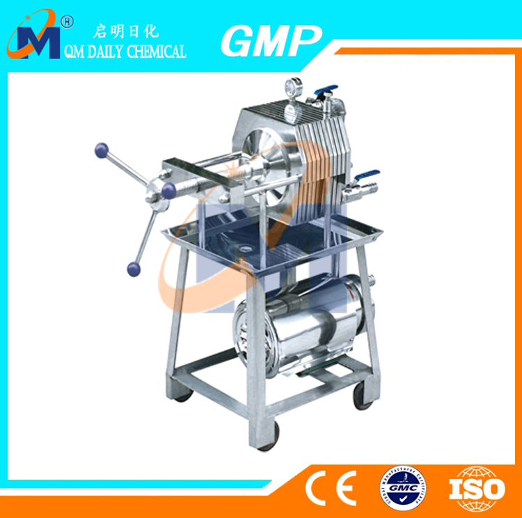 The machine in addition equipped motor, other parts are used 1Cr18Ni9Ti or 316L and high quality anti corrosion of stainless steel materials made, suitable for filtering various pH value of acid and alkali solution, the application of pressurized filter, low filtrate loss, good filtering quality and high efficiency. Small savings and use; the size of the filter part is composed of ten layer filter plate, filter area, circulation, and according to the filtered solution of different production process (initial filter, semi fine filter and fine filter), the replacement of different membranes, and according to customer's production flow may be appropriate to reduce or increase the filter plate number, suitable for the production, so the machine is a machine used for a wide range of characteristics of the filter plate adopts the plane thread mesh shape, advanced structure, no deformation, easy to clean, can effectively increase membrane life, thereby reducing the cost of production, the machine is equipped with stainless steel infusion pump and the matched motor, power consumption province. The base is arranged under the wheel, convenient operation, flexible movement, can be used for mobile use