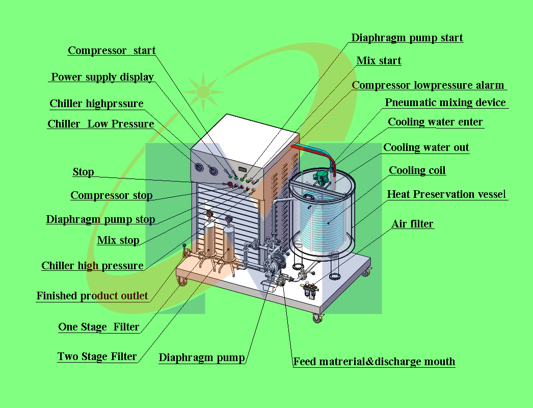 6.Before starting, cooling tank with sufficient material, otherwise the cooling coil in the absence of material contact condition, will cause the refrigeration unit load increased to generate fault.
