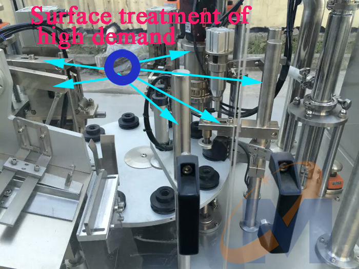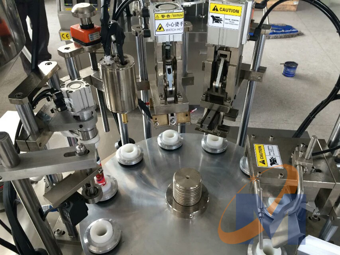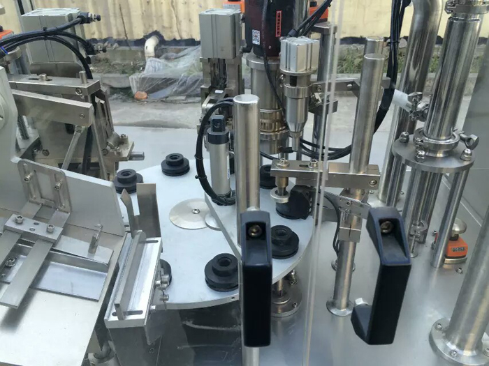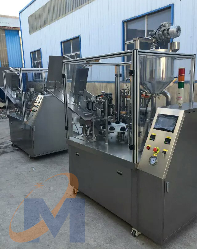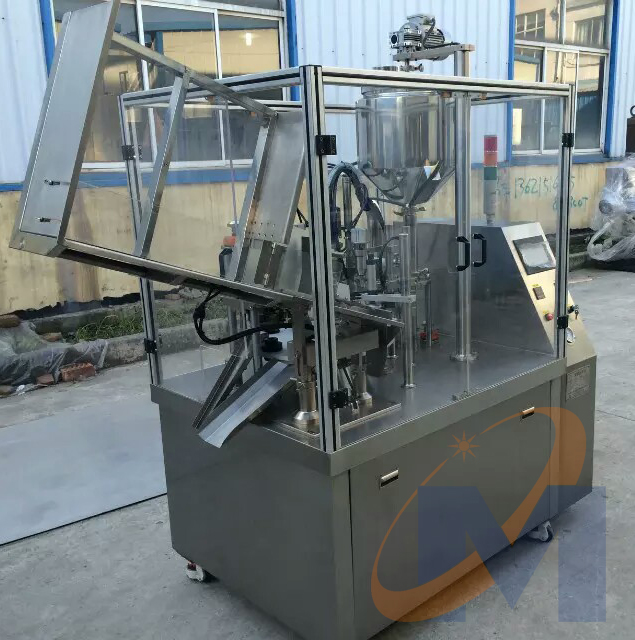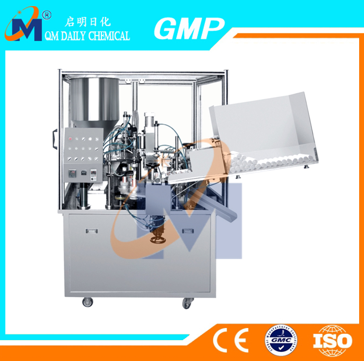 This equipment use Panasonic PLC and sensor. It can automatically fill, seal, stamp batch numbers and exit tubes(with 8 tube position) . Inner-heating and outside –heating method is adopted in the heating section, which can blow hot-wind to the tube tail-ends inner wall. The parts touched with material adopt 304 stainless steel, which can proof acid, alkali and corrosion. All the channels can be unloaded fast and agilely. The material-valve can be rotated, it can be cleanout easily, so there’s no place for the dirty. Fixing organization can fix position precisely and firmly. The position-turning part can change speed by using different-frequency. Customers can adjust the working speed themselves.