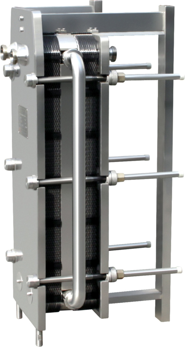 Frame heat exchanger consist of metal plate which container hole, Heat transfer occurs between the two fluids flow through these holes. The plate is fitted between a frame plate and a pressure plate, a bolt. The sealing washer is arranged on the board, to seal the channel and alternatively guide the flow into the channel. The plate number is determined by the physical properties of the fluid velocity, pressure drop and temperature program. In the crease to promote fluid turbulence, and the pressure difference of the plates to play a supporting role. For cooling and heating of liquid food products, pharmaceuticals and other in situ cleaning liquid and water and some applications of the pasteurization.